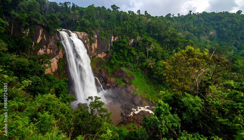 waterfall, rainforest, cascade, cliff, rock, lush, green, nature, tropical, water, mist, spray, jungle, foliage, tree, plant, landscape, scenery, environment, wilderness, serenity, peace, calmness, beauty, power, energy, vibrant, high-coloured, majestic, impressive, stunning, breathtaking, picturesque, exotic, secluded, hidden, remote, adventure, travel, exploration, photo, image, picture, view, perspective, aerial, summer
