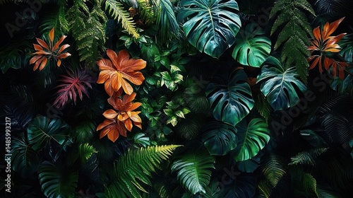 Lush tropical greenery with large dark green leaves and vibrant orange foliage creating a rich and dense jungle atmosphere