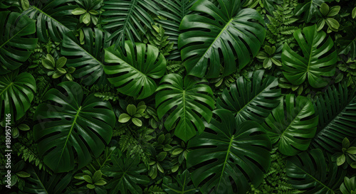 Lush tropical monstera leaves and green foliage forming a dense jungle background with vibrant natural botanical texture