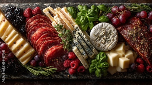 charcuterie, board, cheese, fruit, epicure, meat, platter, berry, basil, rosemary, cheddar, gouda, brie, salami, prosciutto, olive, cracker, nut, presentation, dining, cookery, celebration, rustic, gourmet food, snack, pairing, summer, event, holiday, picnic, meal, arrangement, variety, colourful, culinary, fresh, elegant, savoury, delicious, enjoyment, table, share, taste, indulgence, balancing, decoration, organic, freshness