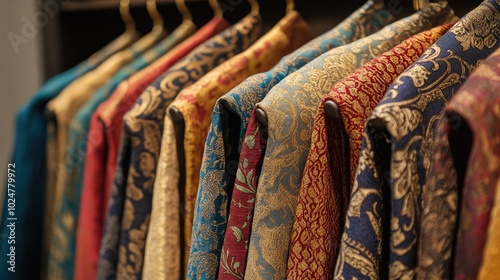 Luxurious dhotis in assorted colors, displayed elegantly on hangers, soft background accentuating their rich patterns.