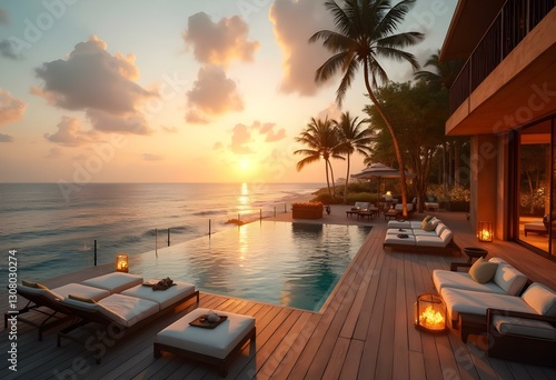 luxurious hotel outdoor lounge area overlooking a breath-taking sea view during sunset