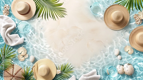 Luxurious hotel pool accessories elegant umbrellas, fresh towels, and clear water in top view image