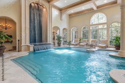 water, pool, waterfall, spa, indoor, relaxation, luxury, design, architecture, interior, home, space, serene, blue, tile, step, elegant, plant, tree, window, light, stone, ceiling, beam, chair, lounge, tranquil, environment, fountain, cascade, modern, decorative, arch, column, fixture, chandelier, potted, nature, daylight, sunny, resort, retreat, comfort, leisure, roomy, clean, pristine