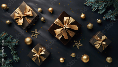 christmas, luxury, holiday, dark background, elegant, gold, festive, decoration, winter, premium, minimal, celebration, copy space, topview