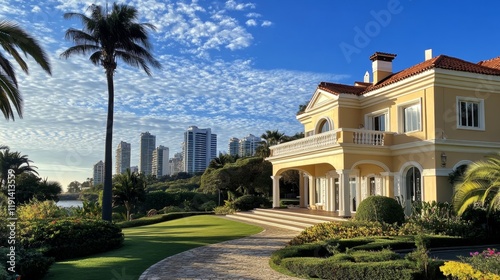 luxury home, impressive, exterior, path, design, city, grass, beautiful, property, garden, column, stunning, day, home, landscaping, charming, palm, estate, grand, tree, cloud, window, house, balcony, green, sky, sunny, door, porch, architecture, elegant, modern, view, picturesque, luxury, sophisticated