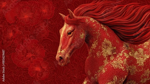 red, gold, chinese, horse, luxury, elegant, festive, celebration, tradition, culture, ornament, decoration, symbolic, auspicious, prosperity, ornate, shiny, regal, glamourous, traditional, ornamental, majestic, opulent, decorative, stunning, grand, bright, stylish, vibrant, rich, elaborate, magnificent, intricate, splendid, beautiful, oriental, cultural, celebratory, lavish, embossed, gilded, glowing, noble