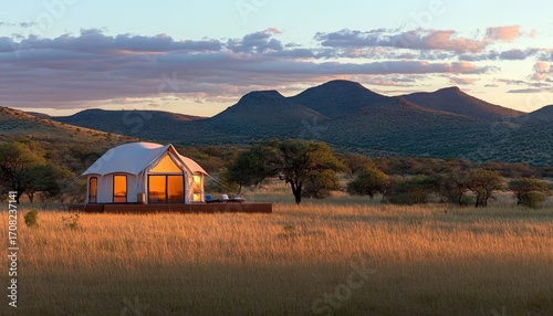 Luxury Savanna Glamping Experience with Tents in Expansive Grass Fields and Scenic Mountains