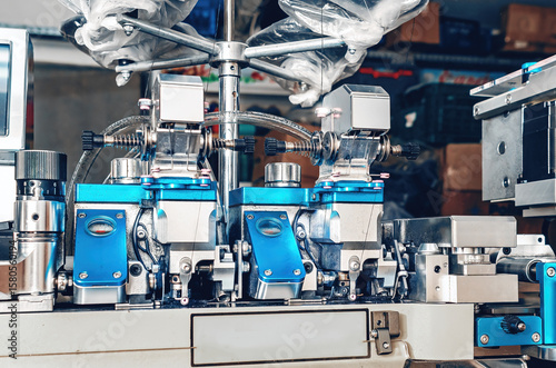 Machine for sewing the toe area of socks. Front view. Textile industry, automatic knitting of socks.