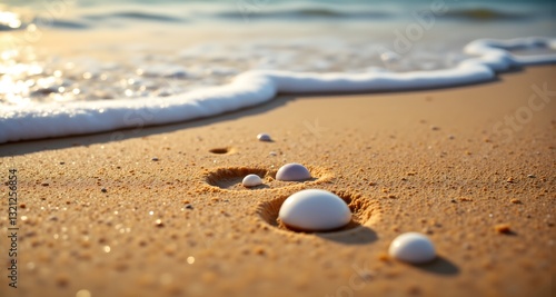Macro close-up of soft golden sand with glistening tiny seashells along the shore, footprints on the beach