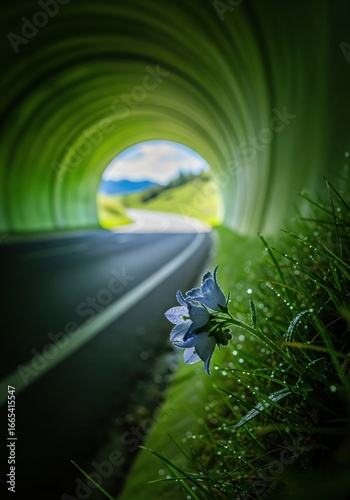flower, dew drops, waterdrop, freshness, macro, closeup, white flower, green, moss, grass, calmness, serenity, peaceful, bloom, plant, bokeh, blurred background, abstract, road, path, journey, future, hope, growth, detail, beauty, outdoors, daylight, morning, spring, vibrant, natural, environment, organic, curve, archway, tunnel, clean, pure, delicate, soft focus, light, perspective, vertical, tranquil scene, scenic