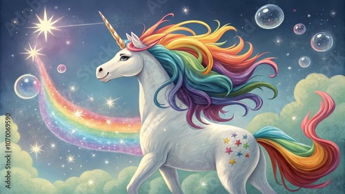 unicorn, rainbow, magical, fantasy, sparkling, star, night sky, dreamy, whimsical, colourful, fluffy, horn, tail, mane, cloud, floating, bubble, enchanted, fairy tale