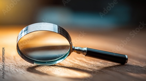 Magnifying Glass Close-Up on Wooden Surface: Discovery, Investigation, and Detailed Examination Concept