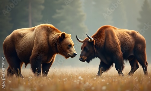 bull, bear, fight, fighting, between, buffalo, standoff, investment, rose colored, bearish, trading, finance, wealth, digital, economy, market, trend, earning, growth, opportunity, money-making, confrontation, nature, wilderness, strength, power, dominance, survival, majestic, predator, dramatic, tension, mammal, fauna, endangered, competition, big, massive, impressive, conflict, highland, meadow, grazing, furry, brown
