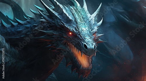 Majestic dragon with piercing eyes and intricate scales set against a mystical background showcasing fantasy elements and dramatic lighting