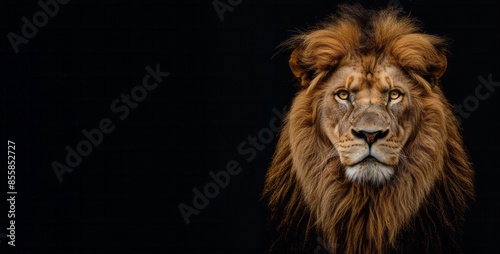 Majestic front view head shot of lion over black background with copy space. Generative AI