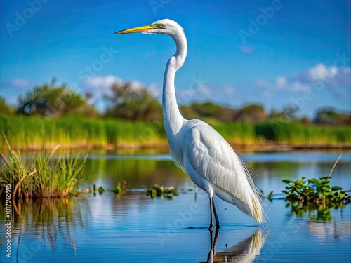 Majestic Great White Egret Standing Gracefully in a Serene Wetland Environment Under Clear Sky