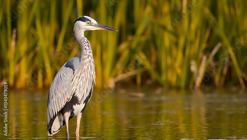 Majestic Heron in Shallow Water with Golden Sunrise Light and Elegant Plumage