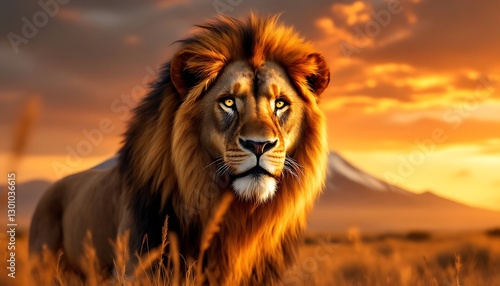 Majestic Lion Portrait with Golden Mane in African Sunset Landscape