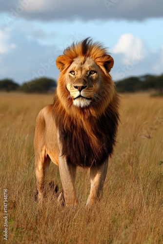 Majestic male lion stands tall, golden mane, grassy savanna.