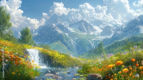 Majestic Mountain Landscape with Waterfall and Vibrant Wildflowers