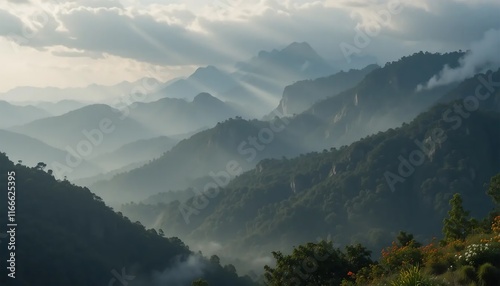 serene, sunbeam, exploration, peaceful, vista, sunrise, cloud, tranquil, mist, photo, outdoors, remote, sky, panorama, hill, fog, morning light, scenic view, green, tree, scenic, nature, peak, travel, natural beauty, beautiful, adventure, landscape, mountain, view, forest, mountain landscape, vale, mountain chain, aerial view, golden hour