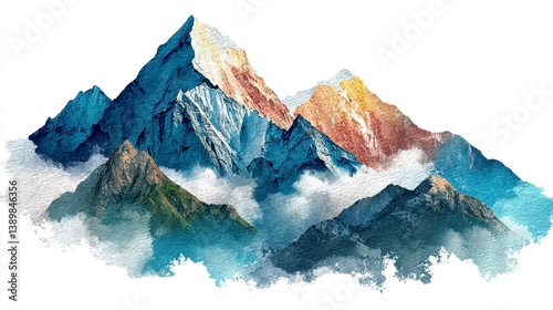 Majestic mountain range with snow capped peaks, partially obscured by clouds, painted in shades of blue, green, and brown.