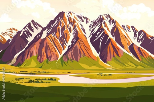 mountain chain, mountain, peak, peak, snow-capped, river, vale, meadow, field, forest, tree, cloud, sky, nature, landscape, scenic, beautiful, majestic, wilderness, wild, natural, travel, adventure, serenity, peace, calmness, hiking, camping, exploration, freedom, postcard, illustration