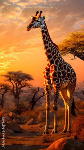 Majestic Solitary Giraffe Grazing Serenely in the Golden Savannah - A Display of Pristine Wildlife