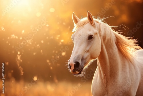Majestic white horse gracefully standing in golden sunlight during a calm evening in a serene field