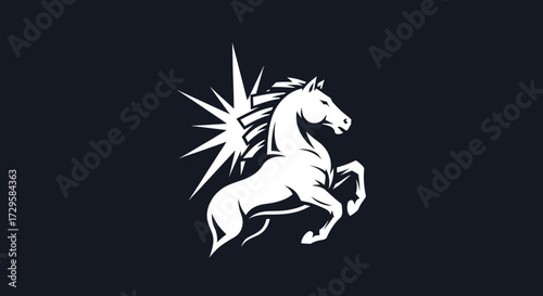 horse, silhouette, white, animal, powerful, speed, strength, energy, burst, radiant, majestic, rearing, design, art, symbol, logotype, icon, graphic, illustration, element, vector, image, digital, modern, contemporary, elegant, noble, freedom, spirit, fantasy, mythology, legend, drawing, vignetting, creative, concept, symbolism, dynamic, motion, aura