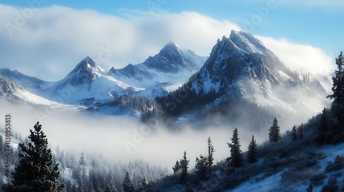 Majestic Winter Mountain Range, Misty Valley. Stunning Scenery, Snowy Peaks, Foggy Landscape.