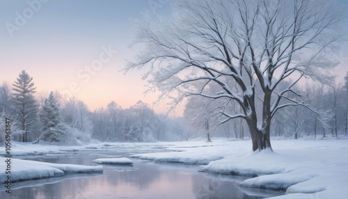 Majestic winter spirit scene featuring a solitary tree by a tranquil river in a frosty landscape at dawn
