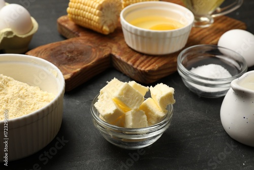 Making cornbread. Different ingredients on black textured table, closeup
