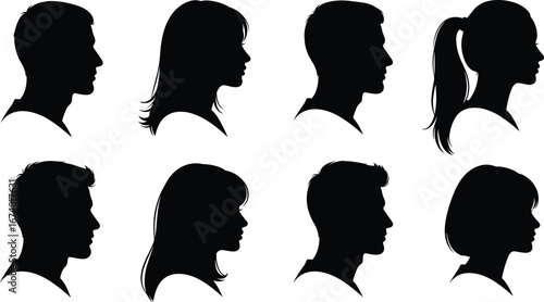 Male and female profile silhouettes, diverse hairstyles, facing left and right, head shapes, human profiles vector illustration for identification and design themes