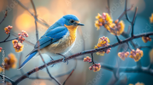 Male Eastern Bluebird on Tree Branch with White Flowers in Spring.Generative AI