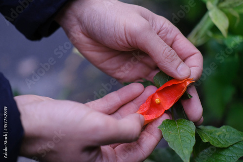 male hand touches the autumn leaves and red fruits of the Physalis plant, close-up, concept of devotive gardening and landscaping