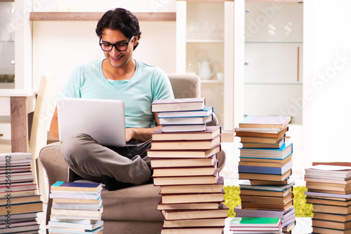 Male student with many books at home