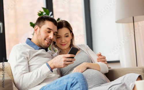 couple, pregnant, smartphone, technology, home, happy, family, man, woman, living room, smiling, people, beautiful, lifestyle, concept, indoor, leisure, pregnancy, expecting, person, young, await, app, application, mobile phone, mobile, mobile phone, phone, communication, connection, online, cyberspace, networking, browsing, showing, talking, sofa, couch, sitting, adult, together, hispanic