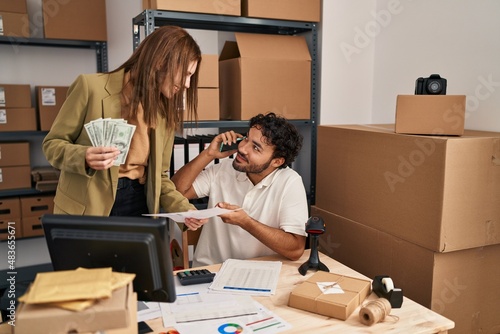 young, adult, person, attractive, man, woman, male, female, guy, happy, confident, smiling, working, men at work, box, cardboard, owner, shipment, delivery, package, packing, shipping, parcel, business, logistic, order, entrepreneur, couple, together, computer, e-business, e-business, smartphone, phone, talking, speaking, dollar, money, banknote, office, workplace, indoor, indoor, interior, room, background