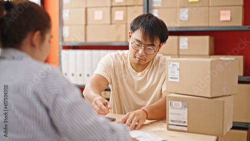 young, adult, person, chinese, hispanic, asian, woman, man, female, male, confident, smiling, work, working, men at work, box, cardboard, shipment, delivery, package, packing, shipping, parcel, business, order, e-business, e-business, online, partner, 2, together, contract, interview, signs, signing, office, workplace, indoor, indoor, interior, room, background, warehouse, storehouse