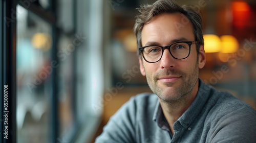 Man confidently looks and smiles at the camera, radiating assurance, symbolizing success and happiness in work and life.
