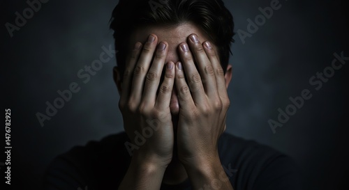 man, face, hand, covering, dark, shadow, sorrowful, grief, despair, stress, anxiety, depression, worried, upset, frustration, pain, emotional, anguish, mental, health, loneliness, melancholy, dramatic, portrait, indoor, close, feeling, hidden, negative, emotion, distress, alone, mood