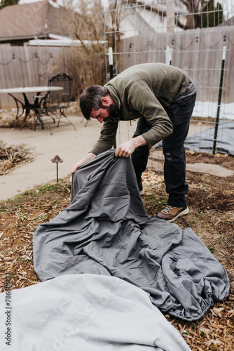 grow, growth, snow, early spring, nature, natural, botany, outside, outdoors, negative space, garden, backyard, spring, april, day, daylight, cloudy day, overcast, midwest, cold, mulch, snow-covered, flower, flower, lily, cold weather, yard, snowflake, gardening, horticulture, home, season, detail, vibrant, colours, woodchips, organic, cultivate, care, real, alive, cultivated land, dirt, ground, chives, allium, food, onion, vegetarian, vegetable, herb, preparation, protection, cover, man, adult, male, he, him, brunette, farmer, gardener, casual clothes, one person, full body, cloudy, ecology, protect, crop, avocation, weather, active, healthy, garlic, green, crop, grey, grey, hold, coat, arch, us, 30s, white