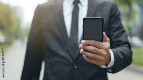 man, suit, smartphone, phone, black, screen, holding, hand, finger, business, urban, outdoors, city, street, background, blurred, closeup, view, technology, communication, social, media, digital, modern, professional, corporate, formal, attire, style, trendy, casual attire, lifestyle, elegant, clean, sharp, stylish, minimal, simple