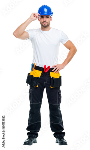Man in Blue Hard Hat with Yellow Tool Belt, Transparent Cutout, Graphic for Web Design