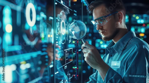 man, blue shirt, magnifying glass, digital display, futuristic, technology, inspection, engineer, science, datum, research, development, innovation, security, network, system, control, monitoring, analysis, globe, goggles, beard, serious, concentrated, screen, interface, chart, graph, information, expert