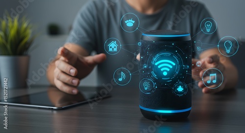 Man interacting with smart speaker interface controlling smart home technology and devices