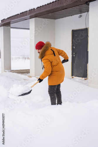 Man is clearing the snow near house and on staircases hovelling at the winter season. Winter storm and season specific