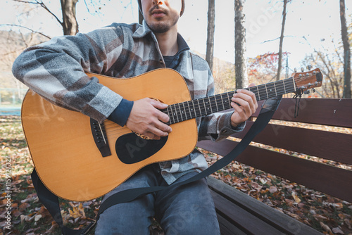 Man playing acoustic guitar outdoors in autumn, wearing a plaid shirt, sitting on a wooden bench surrounded by fallen leaves. Perfect for themes of music, relaxation, and nature
